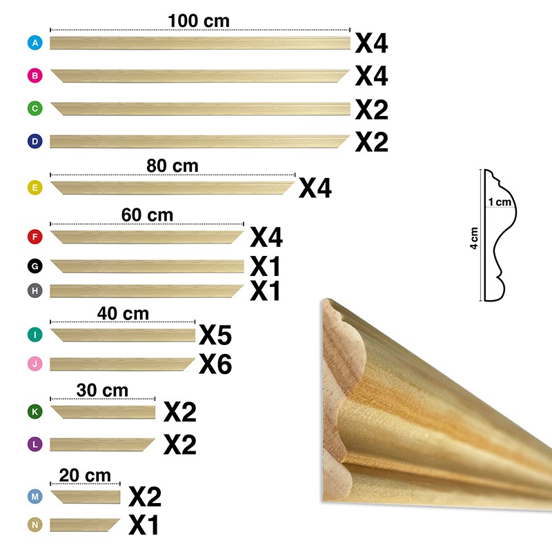 - 3 cimaises de 20 cm avec coupes droites et à 45°