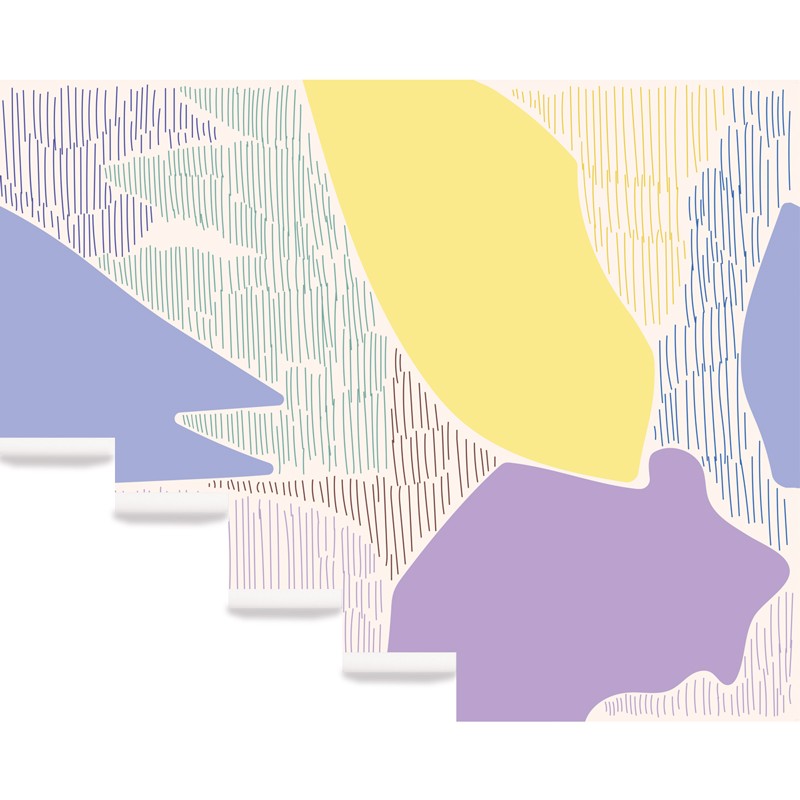 Son motif abstrait mêle formes organiques et tracés rythmés dans une palette douce et lumineuse : lilas, bleu pervenche, jaune pastel, vert menthe et brun cacao sur fond crème. Résolument graphique, ce décor évoque un jardin stylisé baigné de lumière.