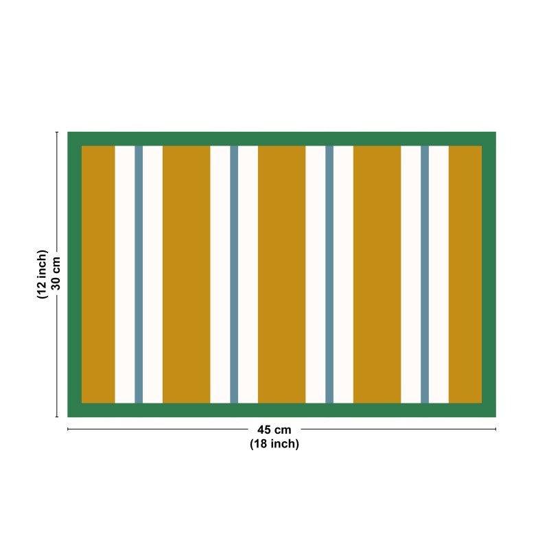 Parfait pour habiller une table avec style, il mêle un doré profond aux accents naturels et apaisants, contrasté par des lignes vertes et bleues qui insufflent du rythme à l’ensemble. Le blanc cassé adoucit le tout, pour une touche chaleureuse et raffinée.