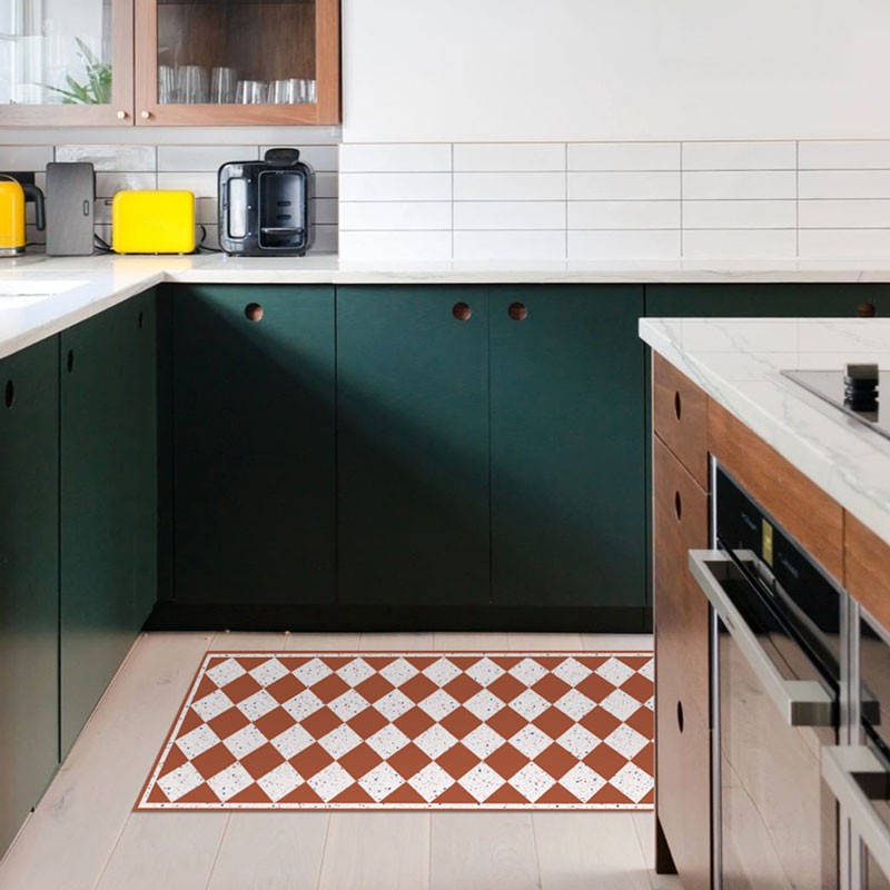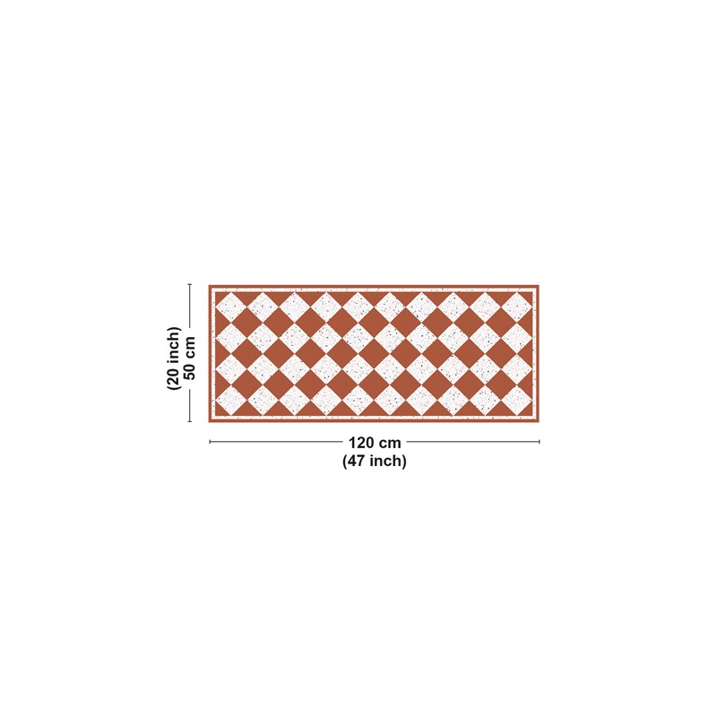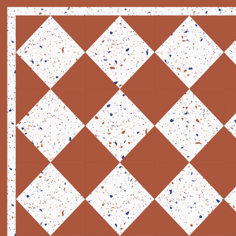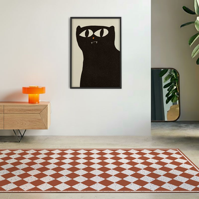Avec notre tapis en vinyle au motif terrazzo damier brique et blanc, apportez une touche d'équilibre, de contraste et d'élégance à votre intérieur.